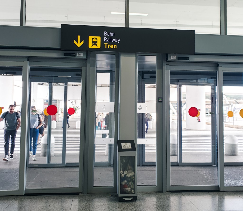 Vienas patogiausių, greičiausių ir pigiausių būdų – pasinaudoti vietinio susisiekimo (cercanias) traukiniu C1 linija, traukinių stotelę oro uoste galima pasiekti iš T2 – T3 terminalo, atvykimų salės, išėjus per pirmą aukštą. Pateikiu detalią informaciją, kaip rasti traukinių stotelę: