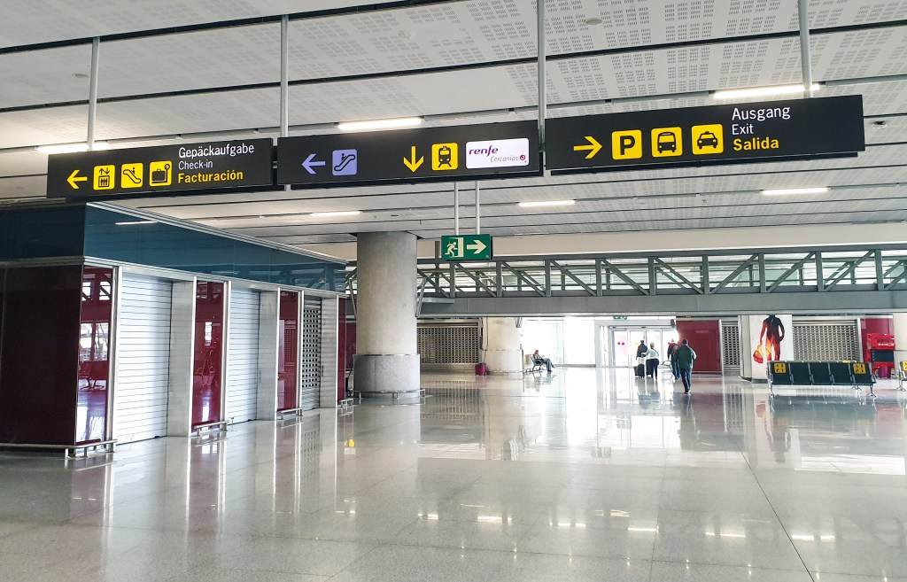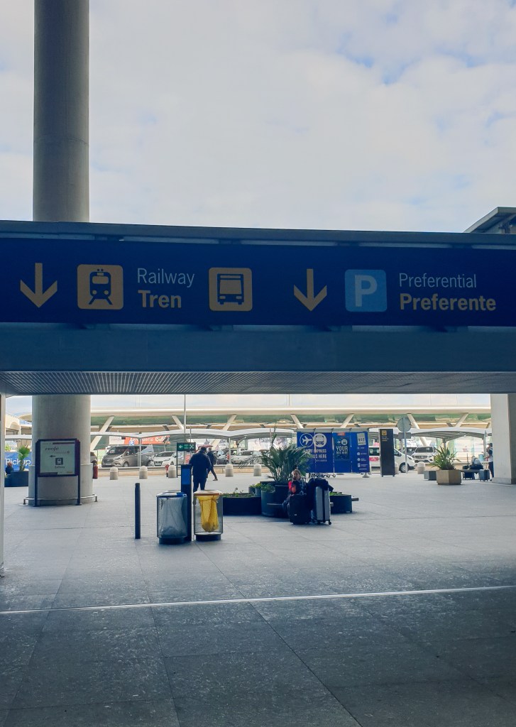 Po stogu pamatysite plačią perėją, pereikite ją ir toliau eikite tiesiai, tikėtina, kad dar eidami per perėją, šiek tiek toliau, dešinėje pusėje pamatysite raudoną iškabą su baltų raidžių užrašu “Aeropuerto” ir traukino rimboliu. Tai ir yra jūsų tikslas – oro uosto traukinių stotelė.