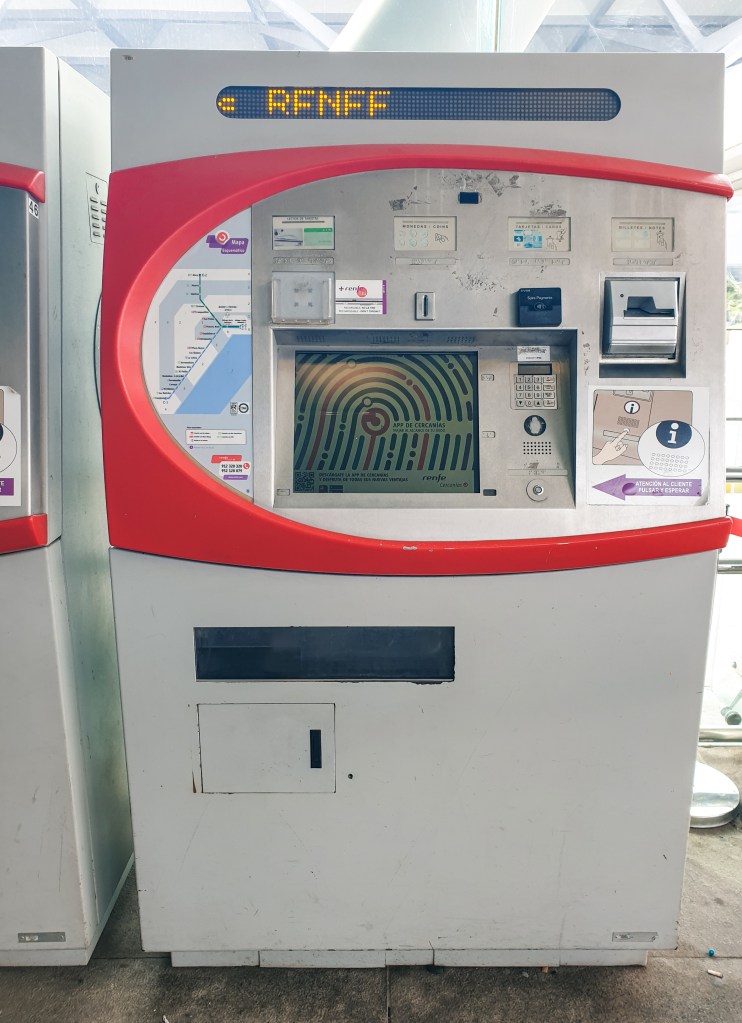 Bilietus įsigykite savitarnos automatuose. Vos tik įėję į Aeropuerto traukinių stotį, dešinėje pusėje pamatysite bilietų pardavimo automatus, kuriuose galėsite pasirinkti norimą kalbą ir nesudėtingai įsigyti bilietėlį reikiama kryptimi.