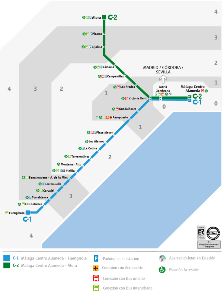 Jei vykstate į pagrindinę Malagos traukinių stotį pasirinkite “Maria Zambrana” stotelę, o jei į Malagos miesto centrą pasirinkite “Malaga centro Alameda” stotelę, tai paskutinė C1 linijos stotelė Malagoje.