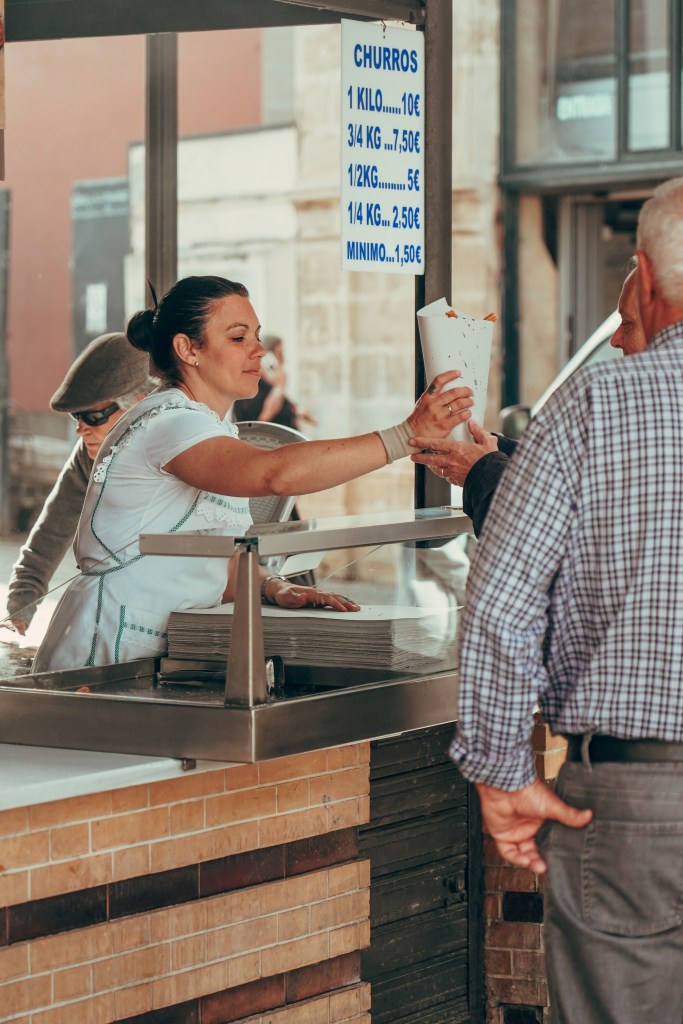 Vos tik priartėję prie turgaus patenkame į aikštę šalia jo. Čia mus pasitinka neįtikėtinai jauki atmosfera, viskas ką matome aplink taip tikra, nesuvaidinta, neišdailinta turistams. Viename kioskelyje kepamos šviežutėlės churros (tradicinis ispaniškas desertas), o vietiniai gyventojai laukia eilėje ir perka juos kilogramais, pardavėja vos spėja vynioti į popierių ir smagiai plepėdama dalinti pirkėjams. Aikštėje gausu lauko kavinių, o visai šalia staliukų įsikūrę pavyzdžiui svogūnų pardavėjai. Taigi, Plaza de Esteve – aikštė šalia turgaus palieka tikrumo jausmą.
