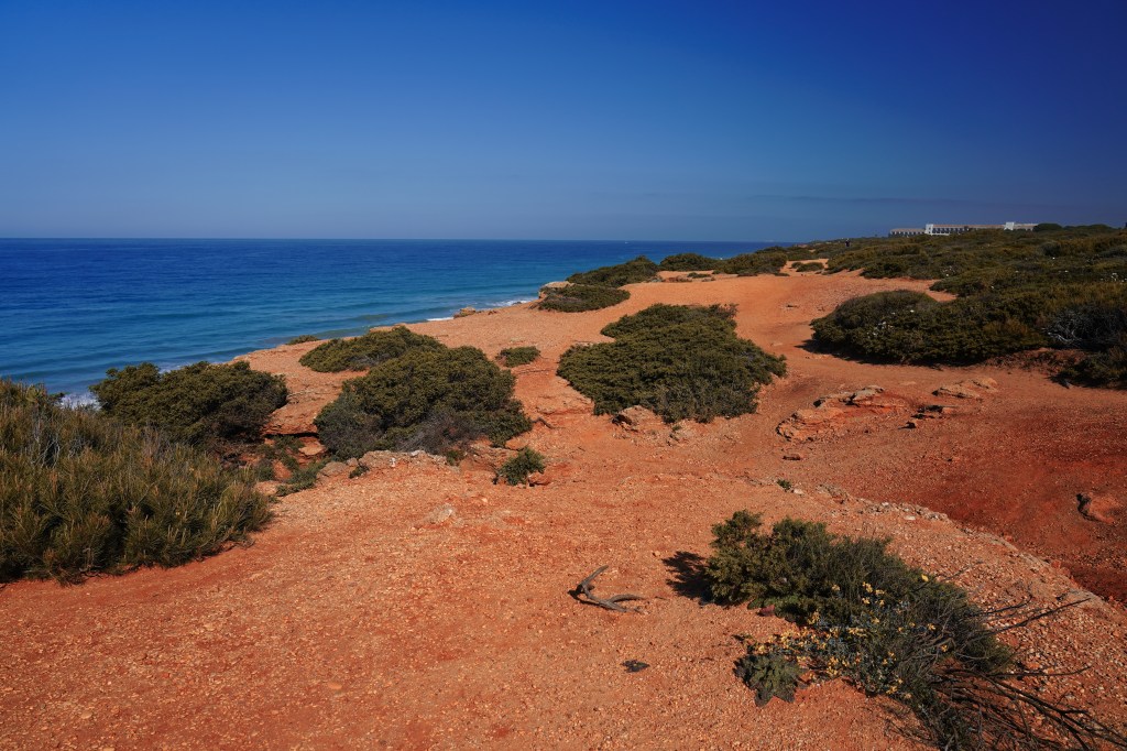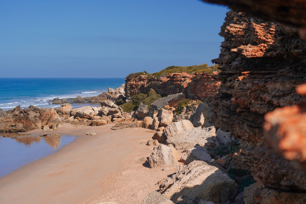 Taigi, šį rytą norime aplankyti šalia miestelio, kuriame esame apsistoję (Conil de la Frontera) esančias įlankas – Calas de Roche, kurias supa didingos uolos, o smėlio krantus skalauja Atlanto vandenynas. Važiuojame tik 8 kilometrus, nebūtų sudėtinga ir nueiti, tačiau likusiai dienai turime daugiau tikslų, tad pastatome automobilį patogioje vietoje ir leidžiamės patyrinėti įspūdingų įlankų. Vos tik išlipus iš automobilio ir pasukus į paplūdimių pusę apsupa natūrali gamta, žingsniuojame oranžinių atspalvių gruntu, supa neaukšti, žali krūmynai, sukuriantys kontrastingą spalvų derinį su gruntu ir mėlynu dangumi. Netrukus prieiname pirmąją įlanką – Cala de Pato. Pasitinka vaizdas į paplūdimį, kuriame dar nėra poilsiautojų. Patogiais, uolienoje išskaptuotais laipteliais nusileidžiame į auksinio smėlio paplūdimį, kurį supa įvairių formų ir atspalvių, aukštos uolos. Bangos čia nedidelės, jas sustabdo priešais paplūdimį esančios uolos. Laisvė – čia randame tai, dėl ko šį kartą atvykome į Kadiso provinciją. Esu įsitikinusi, kad vasaros sezonu čia gausu poilsiautojų, tačiau balandžio vidurys idealus laikas mėgautis vienatve ir ramybe.