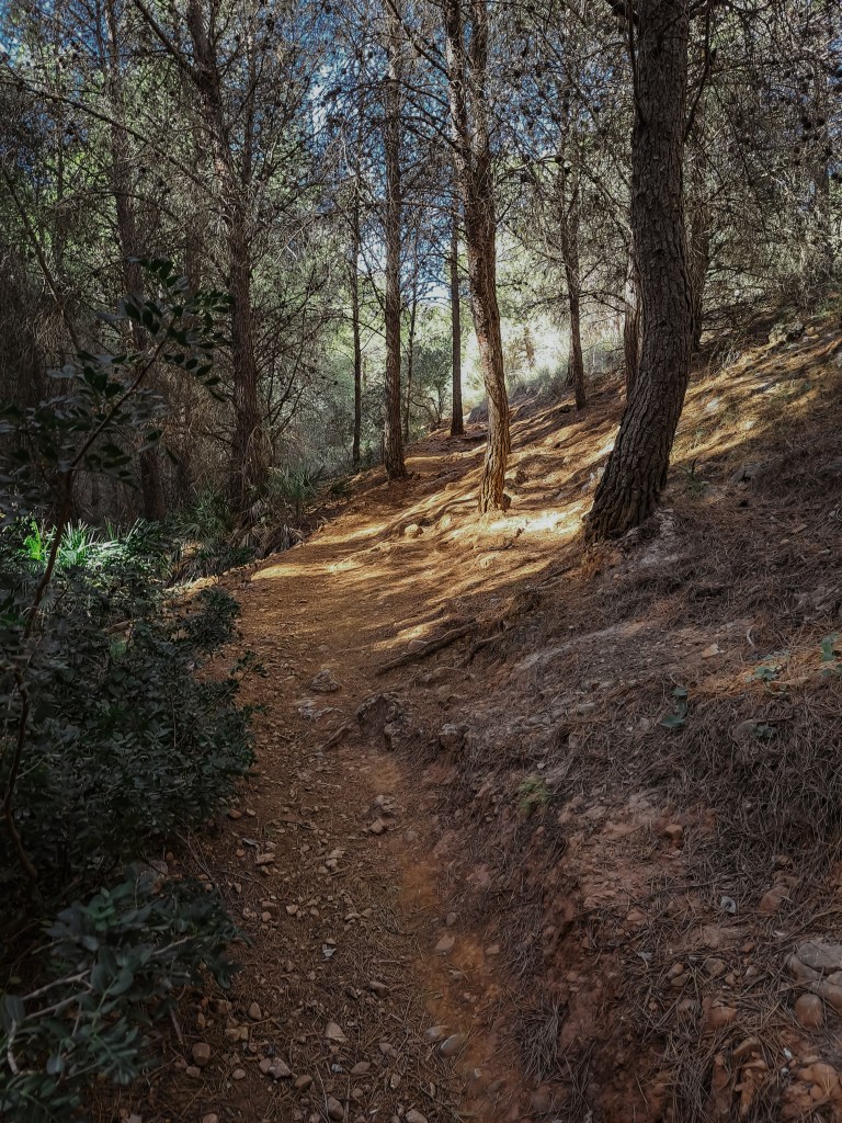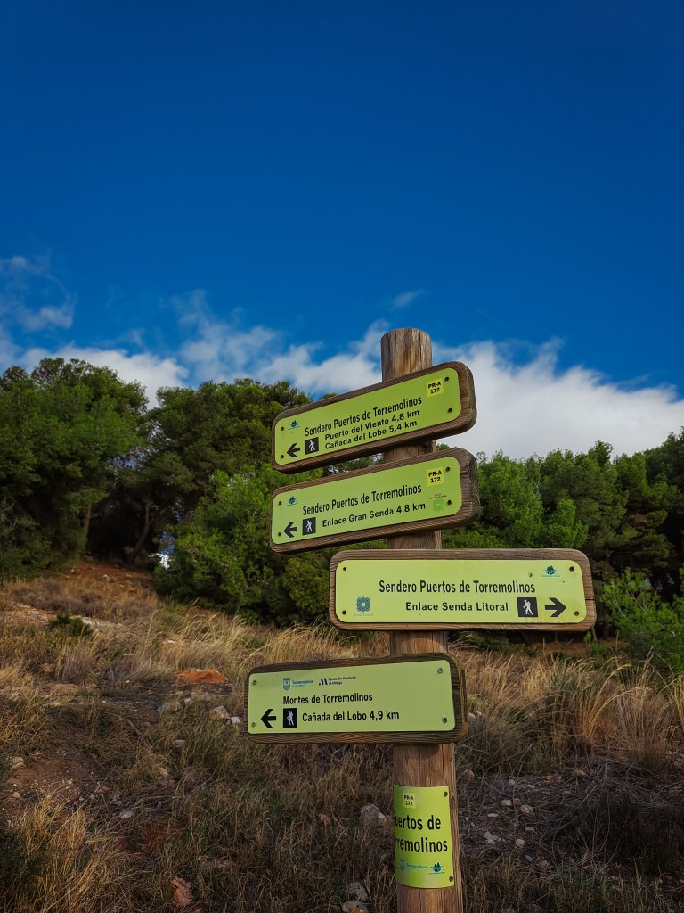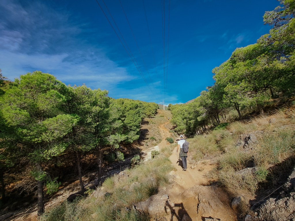 Palikę automobilį aukščiau paminėtoje gatvėje, už kelių metrų pamatėme informacinį stendą apie Sierra de Torremolinos kalnus ir stulpelį su keliomis nuorodomis, ant kurių mažesnėmis raidėmis paminėtas ir mūsų tikslas – Mirador de la Cañada del Lobo. Pasukame dešiniau, nurodyta kryptimi. Toliau vadovaujamės AllTrails programėlėje esančiu žemėlapiu: https://www.alltrails.com/trail/spain/malaga/mirador-del-lobo. Vadovaudamiesi AllTrails programėlėje esančiu žemėlapiu kartais nukrypstame nuo oficialios trasos, tačiau vis tiek sėkmingai judame reikiama linkme. Iš pradžių maršrutas veda per pušyną, kartas nuo karto pereiname išsausėjusią upės vagą arba einame šalia jos.