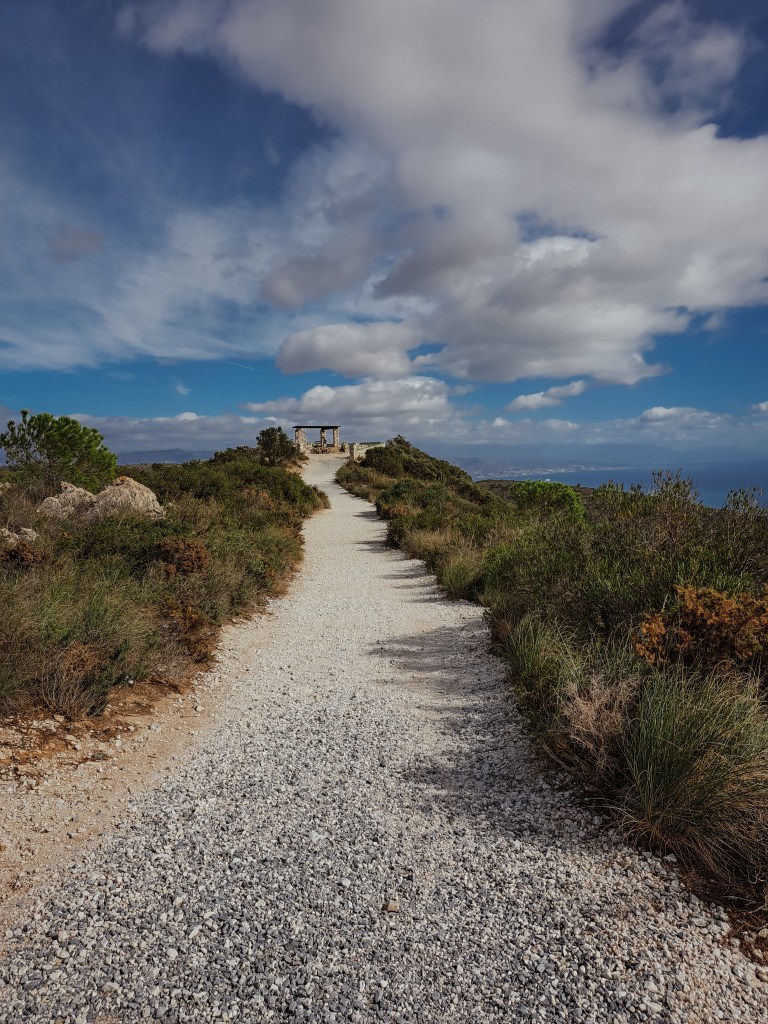 Čia prasideda sunkesnė maršruto atkarpa, kur pakilimas statesnis ir takas labiau uolėtas, todėl tempas kiek sulėtėja, takas vingiuoja į viršų, kol, neilgai trukus pasiekiame gražų, baltų akmenukų takelį, juo pasukame į dešinę ir pagaliau pasiekiame apžvalgos aikštelę su informaciniais stendais ir staugiančio vilko skulptūra. Iš aikštelės atsiveria platūs vaizdai į miestą ir Viduržemio jūrą.