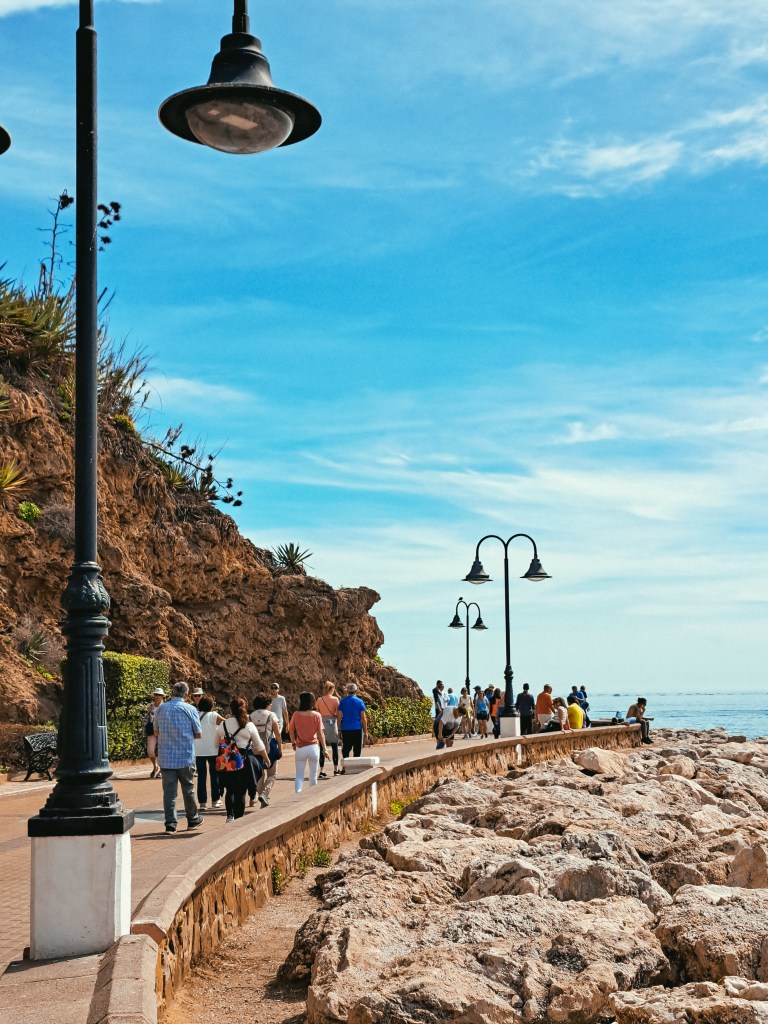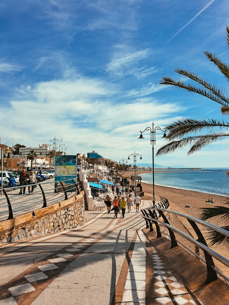 Leidžiamės į gražiąją Benalmadenos promenadą – Paseo Maritimo. Nors dar tik kovo vidurys, tačiau promenada šurmuliuoja, restoranai ir paplūdimio barai ruošia staliukus išalkusiems miestelėnams ir turistams bei kepsnines kepti šviežius sardinių iešmelius (Espetos de Sardinas). Promenados grindinį puošia mozaikos, tad einant net ir po kojomis yra į ką pažiūrėti.