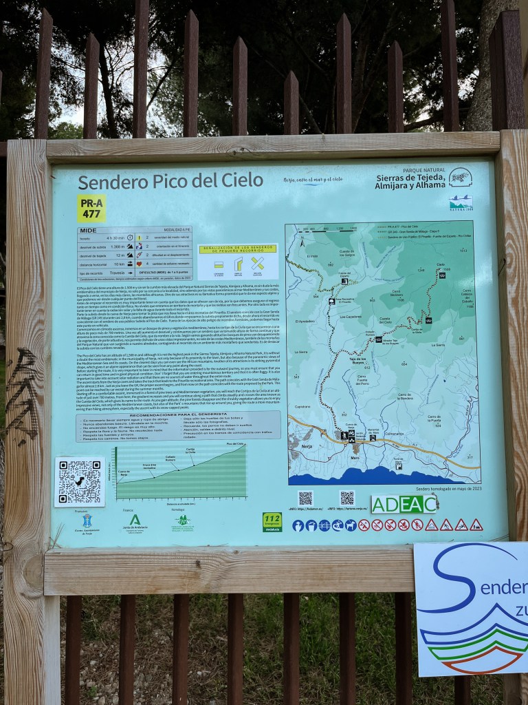 Žygio pradžia – šalia populiariųjų Nerja urvų (Cuevas de Nerja) esanti automobilių stovėjimo aikštelė – Parking Subida Pico del Cielo >>. Čia rasite informacinį stendą ir nuorodas, nurodančias maršruto pradžią. Bendras maršruto ilgis pirmyn ir atgal siekia apie 20 kilometrų, todėl tai yra visos dienos žygis.