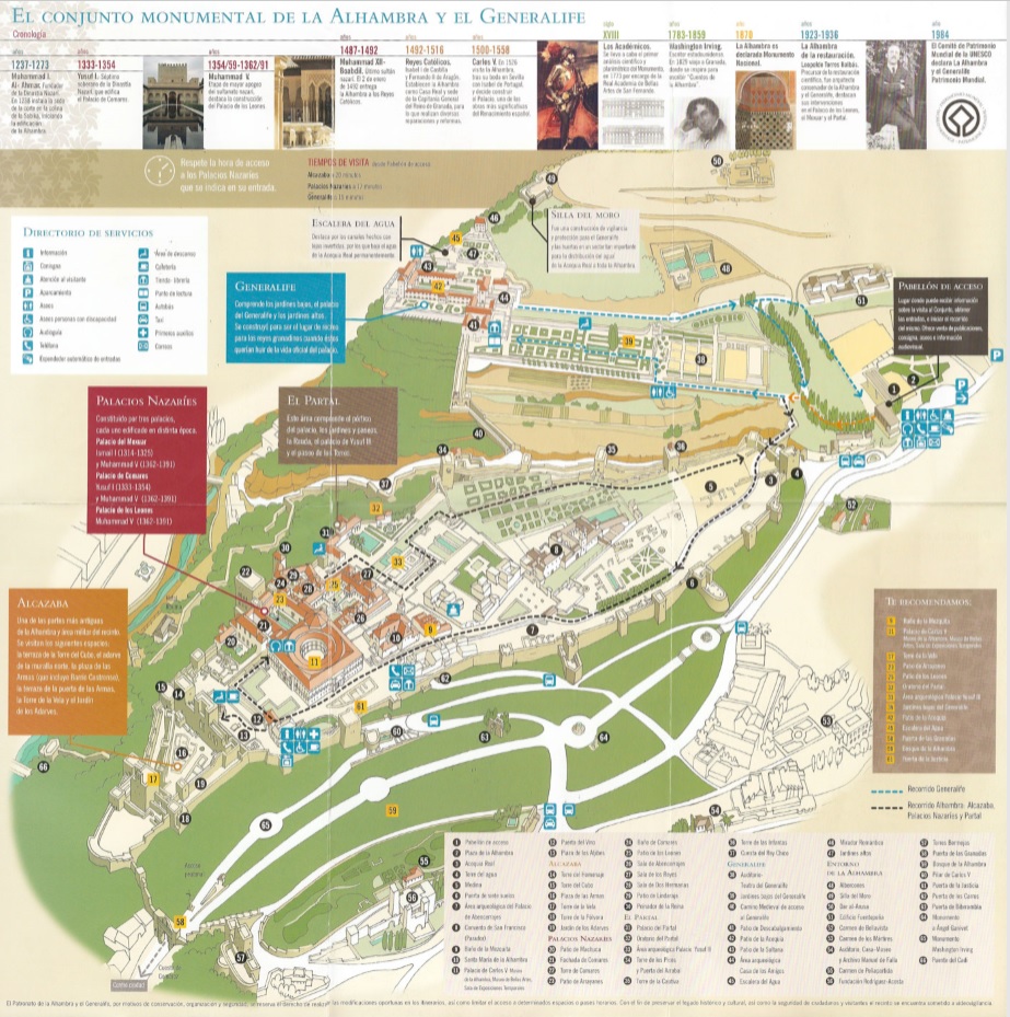 Ir tai ne viskas, pasivaikščiojimo metu po Alhambra kompleksą pmatysite istorinių vartų, bokštų, aikščių. Žemiau esančiame žemėlapyje galite matyti, kad šiame komplekste išties daug lankomų vietų.