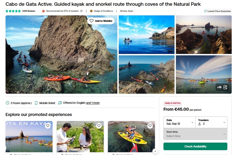 Leiskitės į nepamirštamą kelionę baidare per Cabo de Gata pakrantes, tyrinėdami paslėptas įlankas, uolas ir įspūdingus pakrantės urvus. Jus lydės patyręs gidas, tad galėsite mėgautis gamta be rūpesčių, o ryšio radijo dėka lengvai seksite jo nurodymus. Baidarė, irklai, gelbėjimosi liemenė ir geriamasis vanduo įskaičiuoti – tiesiog atsipalaiduokite ir leiskite sau būti nustebintiems.