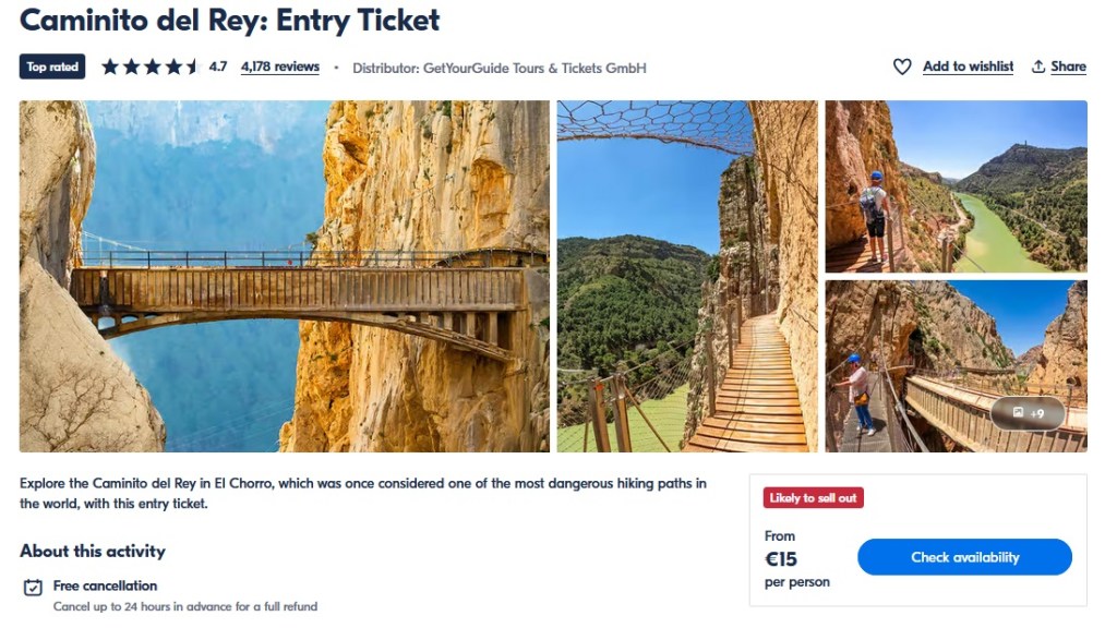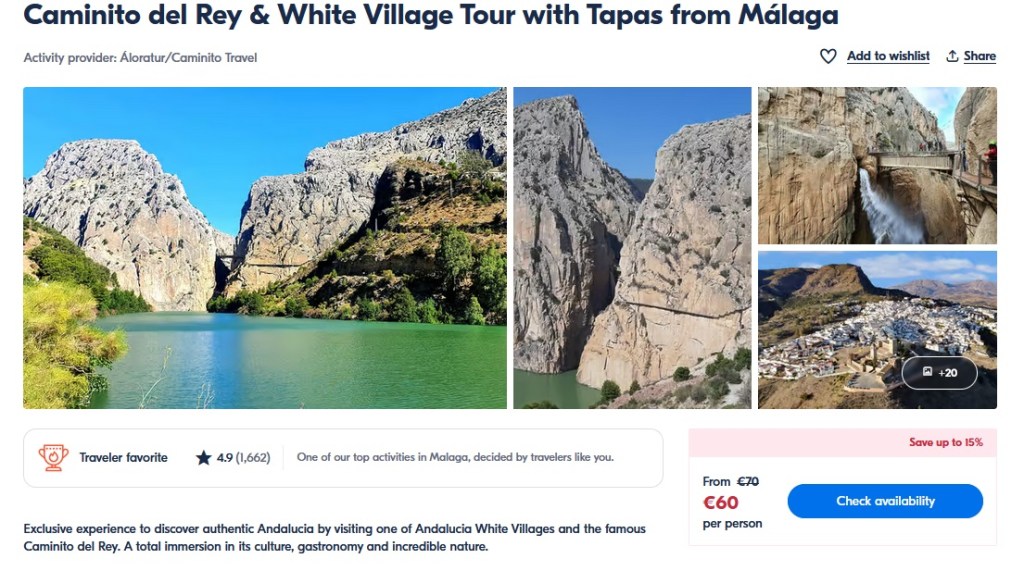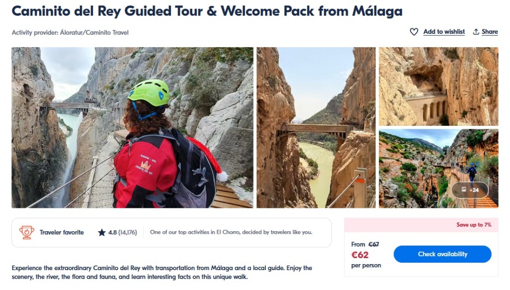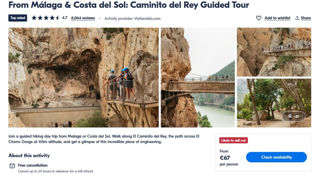 - į kainą dažnai įtraukti bilietai į Caminito del Rey (kuriuos ne visada paprasta gauti savarankiškai)