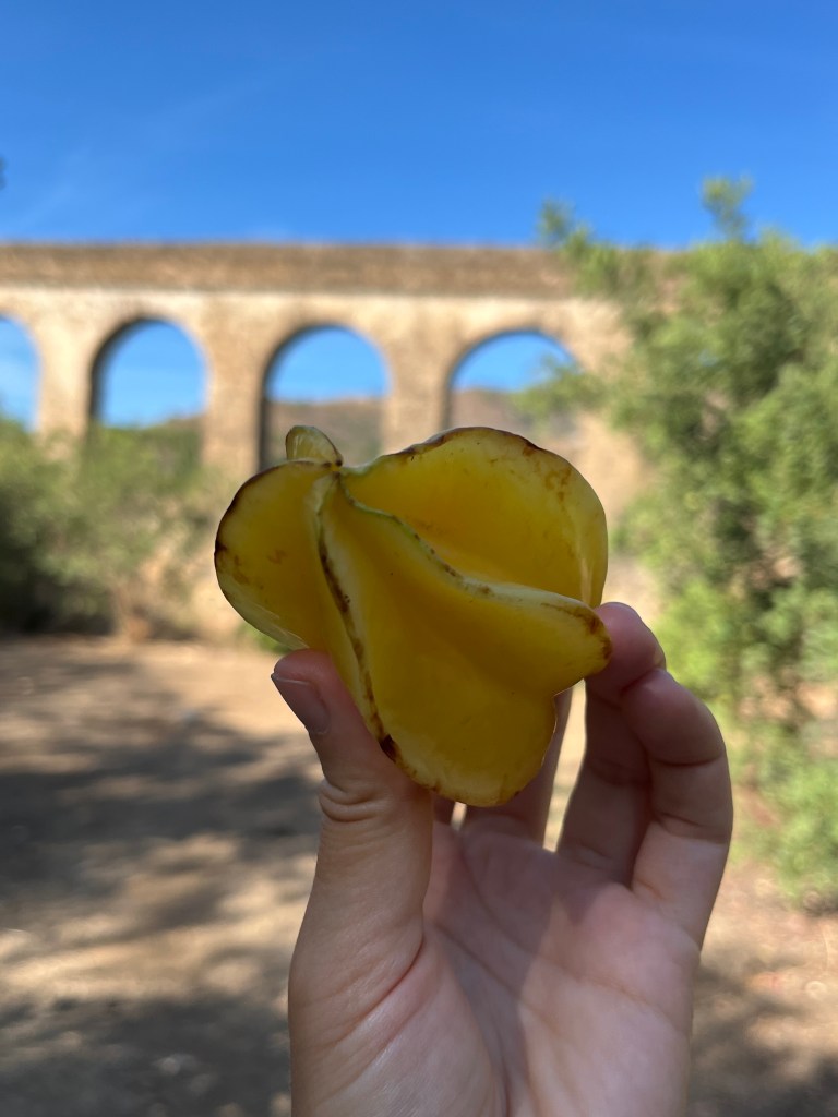 Carambola, dar vadinamas žvaigždėvaisiu, – tai ryškiai geltonas tropinis vaisius, kuris perpjautas skersai atrodo kaip maža penkiakampė žvaigždė. Jo minkštimas sultingas ir traškus, o skonis – gaivus, šiek tiek saldžiarūgštis, primenantis obuolio ir citrusų derinį. Andalūzijoje šis vaisius noksta rudenį ir žiemą, ypač Costa Tropical pakrantėje, kur šiltas klimatas leidžia augti egzotiškiems augalams. Carambola ne tik džiugina akį, bet ir naudinga sveikatai – ji turi daug vitamino C, antioksidantų ir beveik neturi kalorijų, todėl puikiai tinka lengvam užkandžiui ar desertui.