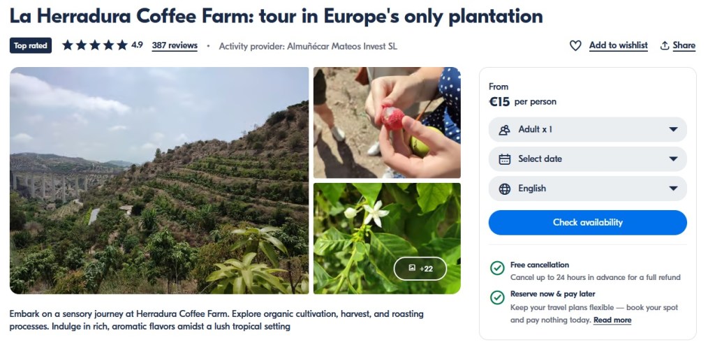 Jei kelionės metu norisi patirti kažką tikrai unikalaus, rekomenduoju apsilankyti La Herradura Coffee Farm – tai viena iš nedaugelio vietų Europoje, kur veikia kavos plantacija kartu su tropinių vaisių ūkiu. Ekskursija trunka apie 70 minučių: ūkio savininkas supažindina su ekologiniu kavos auginimu, rodo daug egzotinių vaisių rūšių – nuo mangų iki avokadų ir chirimoyų – bei paaiškina, kaip ūkyje tausojama dirva ir optmiziuojamas vandens naudojimas. Po pasivaikščiojimo po sodus galėsite įsigyti produktų tiesiai iš šeimos ūkio.